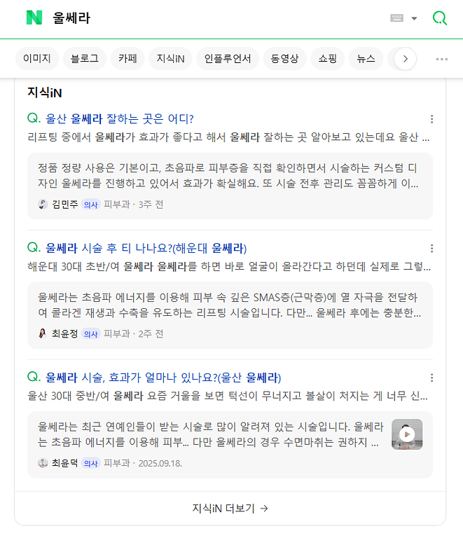 피부/성형 외에도 한의원, 치과 등의 지식인 닉네임을 보면 대부분 의사명이고, 더러 병원명으로 활동하는 것들을 볼 수 있는데요.