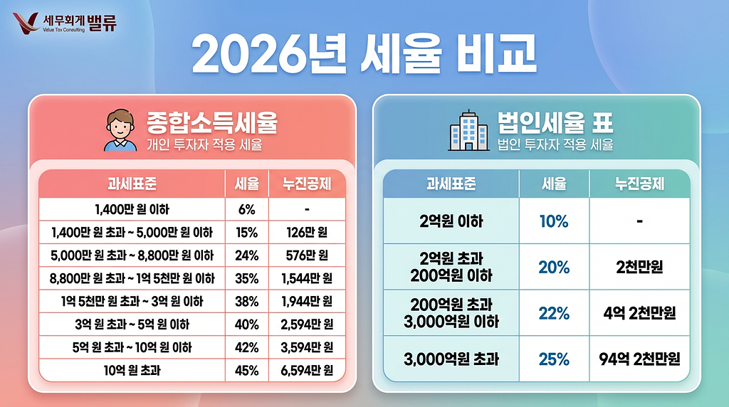 우선, 법인과 개인의 세율차이는 다음과 같습니다.