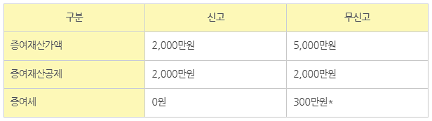 즉, 신고만 해두었더라면 세금이 0원이었을 상황이,무신고로 인해 300만 원의 증여세가 발생하는 셈이죠.