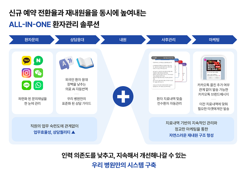 이런 문제를 해결하기 위해 최근 안정적인 병원들은 재진 환자 관리를 체계적으로 자동화하는 방향으로 나아가고 있습니다.