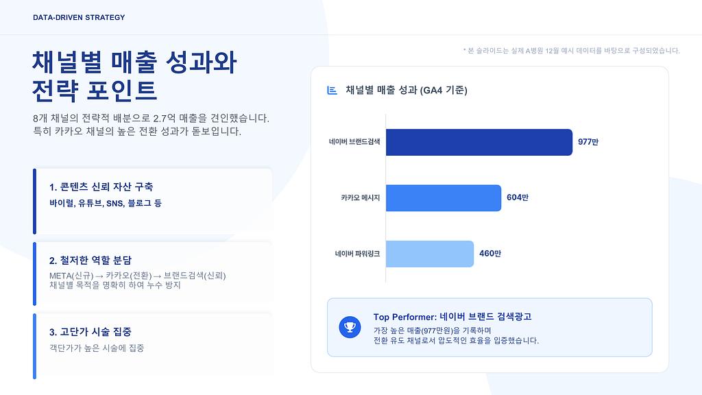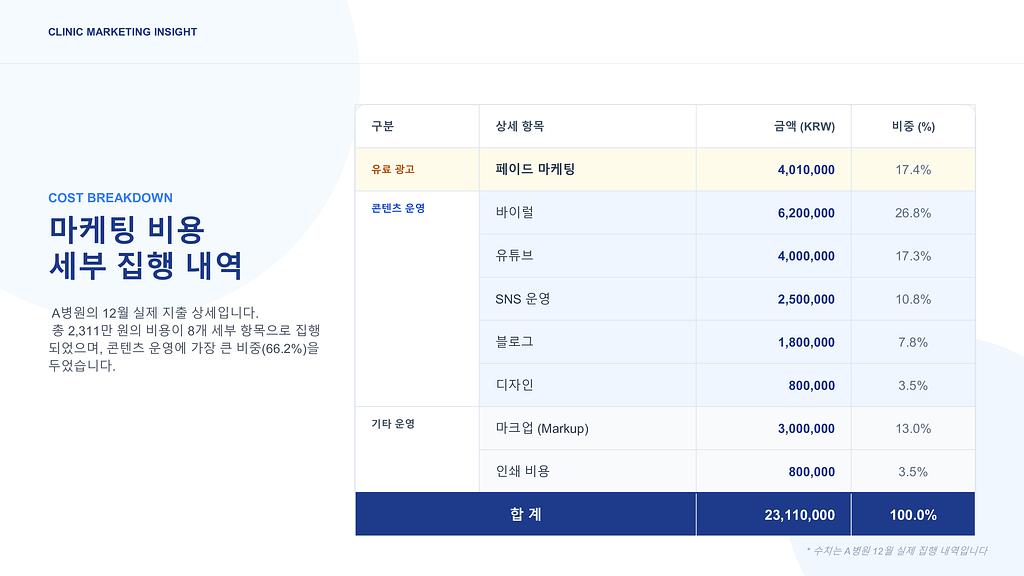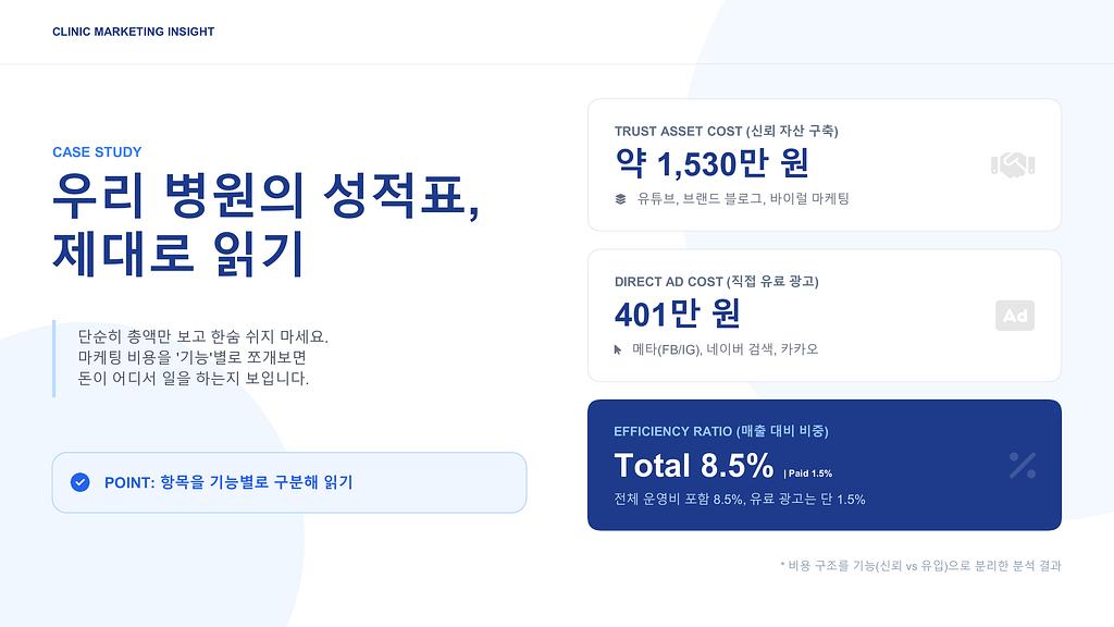 여기서 주목할 점은 '매출 대비 마케팅비 비중이 8.5%' 라는 것입니다. 보통 매출의 10~15%를 광고비로 써야 한다고들 하지만, 이 병원은 데이터 기반 설계를 통해 효율을 극대화했습니다. 특히 실제 환자를 직접 데려온 '유료 광고비'는 단 401만 원, 즉 매출의 1.5%뿐이었습니다.