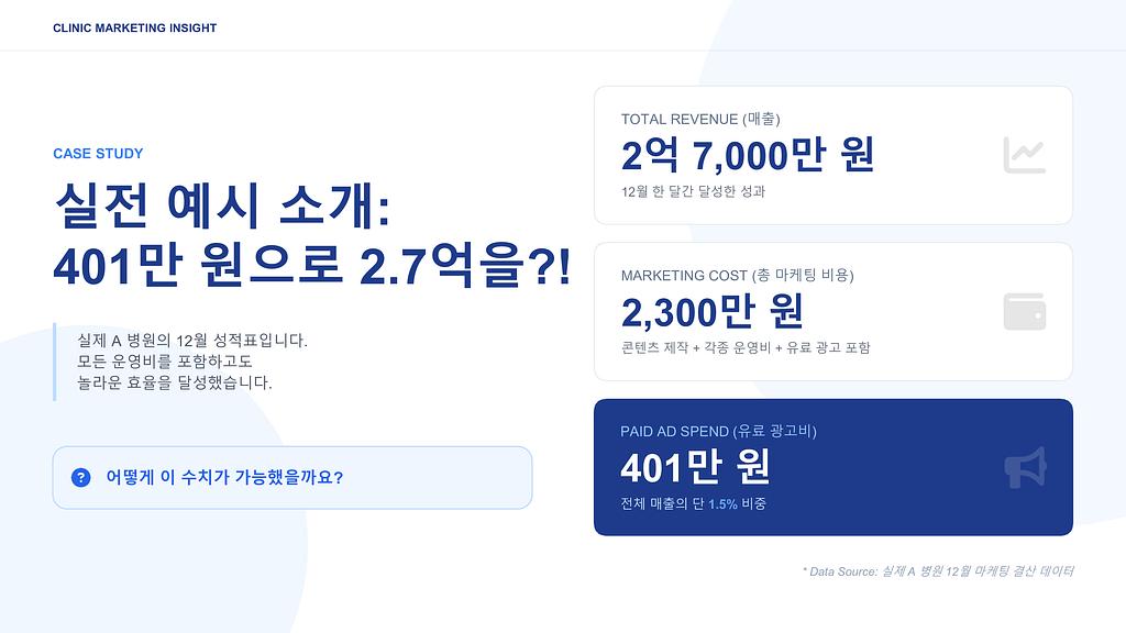 A 병원이 한 달간 집행한 전체 마케팅 비용은 약 2,300만 원이었습니다. 브랜드 블로그, 유튜브, 카페 바이럴, 유료 광고가 모두 포함된 금액이죠. 이를 통해 거둔 추적 매출은 총 2억 7,000만 원입니다.