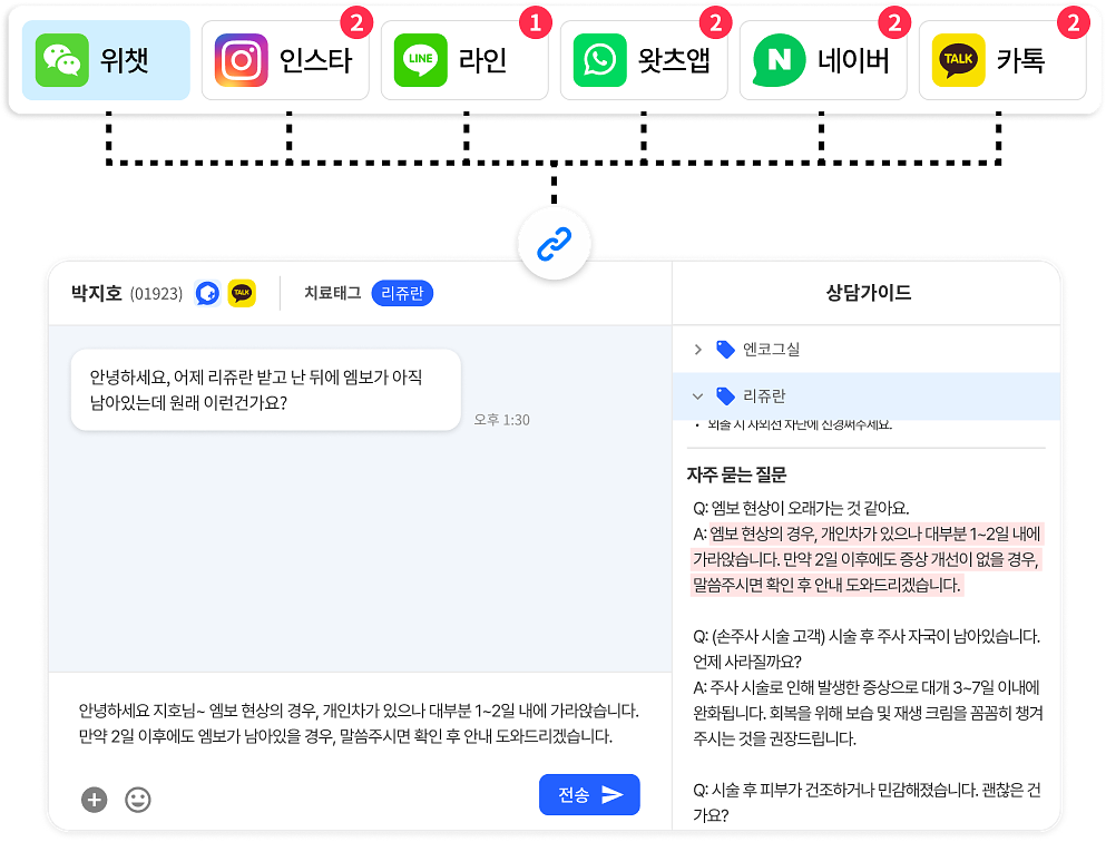 단순 예약이나 반복되는 문의를 전화 대신 채팅으로 유도하고, 여러 창구의 상담을 한곳에서 관리합니다.