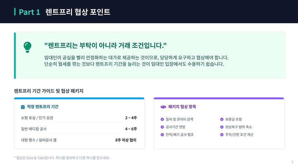 한 가지 팁을 드리면, 단순히 월세를 깎는 것보다 렌트프리 기간을 늘리는 것이 임대인 입장에서 수용하기 훨씬 쉽습니다. 월세 계약 단가를 건드리면 심리적 저항이 크거든요.