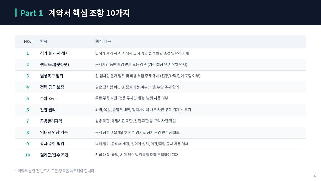 5번, 주차 조건. 6번, 간판 권리. 7번, 공용관리규약 사전 확인. 8번, 임대료 인상 기준. 9번, 공사 승인 범위. 10번, 권리금 및 인수 조건까지입니다.