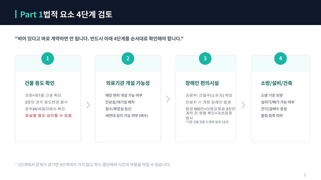 2단계, 의료기관 개설 가능성 확인입니다. 해당 면허로 개설이 가능한지, 진료실과 대기실 배치가 되는지, 접수 및 화장실 동선이 법적 기준을 충족하는지, 세면대 설치를 위한 배수 공사가 가능한지 확인하셔야 합니다.
